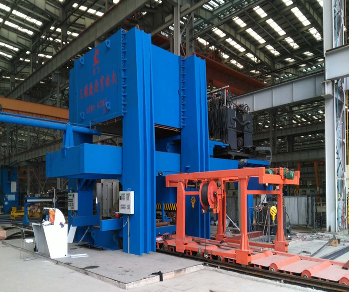 三維數(shù)控彎板機(jī)是專門用于船體多曲面外板冷加工的自動(dòng)化數(shù)控設(shè)備,適合壓制帆型、馬鞍形等復(fù)雜雙曲度船體外板。設(shè)備配置了專門的數(shù)控系統(tǒng),與常用的造船設(shè)計(jì)軟件具有曲板數(shù)據(jù)轉(zhuǎn)換通訊接口,能根據(jù)讀入的船體外板的形狀、曲率變化、板材長度、厚度和材料的強(qiáng)度等數(shù)據(jù)自動(dòng)調(diào)整下模的形狀,進(jìn)行彎壓處理。在彎壓過程中,數(shù)控系統(tǒng)能自己記錄彎板過程中的回彈量,為后續(xù)壓制板材提供數(shù)據(jù),加工效率高、精度高,可實(shí)現(xiàn)長時(shí)期連續(xù)自動(dòng)化作業(yè)。主要性能技術(shù)參數(shù)1、加工鋼板的最大屈服強(qiáng)度σs=750 MPa 2、可彎制板材厚度6mm~30mm,板寬0.6m~2m,板長不限制(托輥送料)3、單張板的最大重量8噸 4、板料輸送速度≥3m/min 5、最大上升高度(距地坪)≥1000mm
