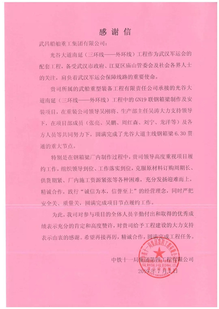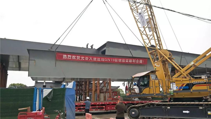 光谷大道南延(三環(huán)線?C?C外環(huán)線)工程作為武漢軍運會的配套工程,備受武漢市政府、江夏區(qū)廟山管委會和社會各界人士的關(guān)注,并肩負著武漢軍運會保障線路的重要使命。武船集團重裝公司承接的光谷大道南延(三環(huán)線?C?C外環(huán)線)工程中的GN19聯(lián)鋼箱梁制造及安裝任務(wù),結(jié)構(gòu)重量3347噸,共計82個節(jié)段,在各方人員共同努力下,圓滿完成了光谷大道主線鋼箱梁貫通的重大節(jié)點。特別是在鋼箱梁廠內(nèi)制作過程中,重裝公司高度重視項目節(jié)點履約工作,組織領(lǐng)導(dǎo)到位、工作落實到位,克服了原材料訂購周期長、供貨期緊、廠內(nèi)施工資源緊張等各種困難,充分發(fā)揚迎難而上,精誠合作,踐行“誠信為本,信譽至上”的經(jīng)營理念,同時嚴把安全關(guān)、質(zhì)量關(guān),圓滿完成項目節(jié)點履約工作。