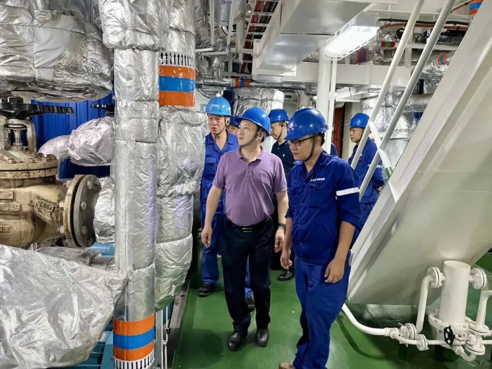在交船隊項目現場,田軍登上在制船舶,詳細檢查每艘待交付船舶的在泊狀態,并與各項目負責人進行交流,了解船舶計劃周期完成率等情況,對安全、質量等方面提出具體要求,對船舶交付前的部分內裝細節提出優化改造建議,確保向船東交付精品船舶。田軍還通過電話形式,向在寧波的6000噸產品項目組了解產品建造進度,對建造人員表示親切慰問。