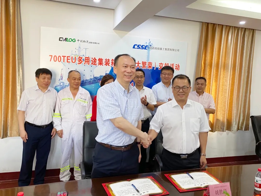 8月4日8時18分,由中國船舶武船集團為中創(chuàng)物流青島遠(yuǎn)大均勝海運有限公司建造的700TEU多用途集裝箱首制船(遠(yuǎn)大繁榮),在江蘇南通順利交付。中創(chuàng)物流青島遠(yuǎn)大均勝海運有限公司董事長高兵、上海船舶研究設(shè)計院副院長周志勇、武船集團副總經(jīng)理姚勝華出席了交船活動。