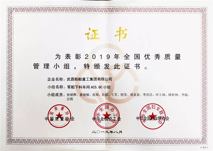 ▲軍船公司下料車間ACS.QC小組獲得“2019年全國(guó)優(yōu)秀質(zhì)量管理小組”榮譽(yù)稱號(hào)