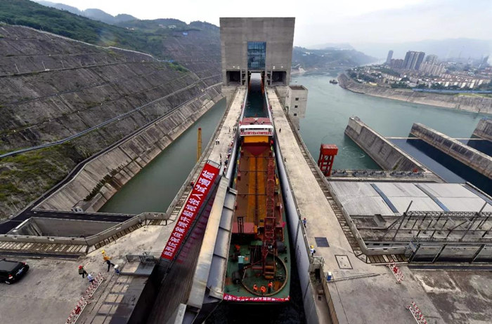 向家壩 升船機金結設備的制造、安裝、調試開始于2013年3月,歷時62個月,終于在今天成功對社會開放,開啟長江至金沙江的大門。試通航期間計劃每日通過4~8條船。這標志著長江黃金水道向上游金沙江流域延伸了175公里,途徑四川、云南兩省的7個縣,將長江黃金水道聯(lián)通至云貴川,開啟造福云貴川之路,起到“一帶一路”造福地方的作用。