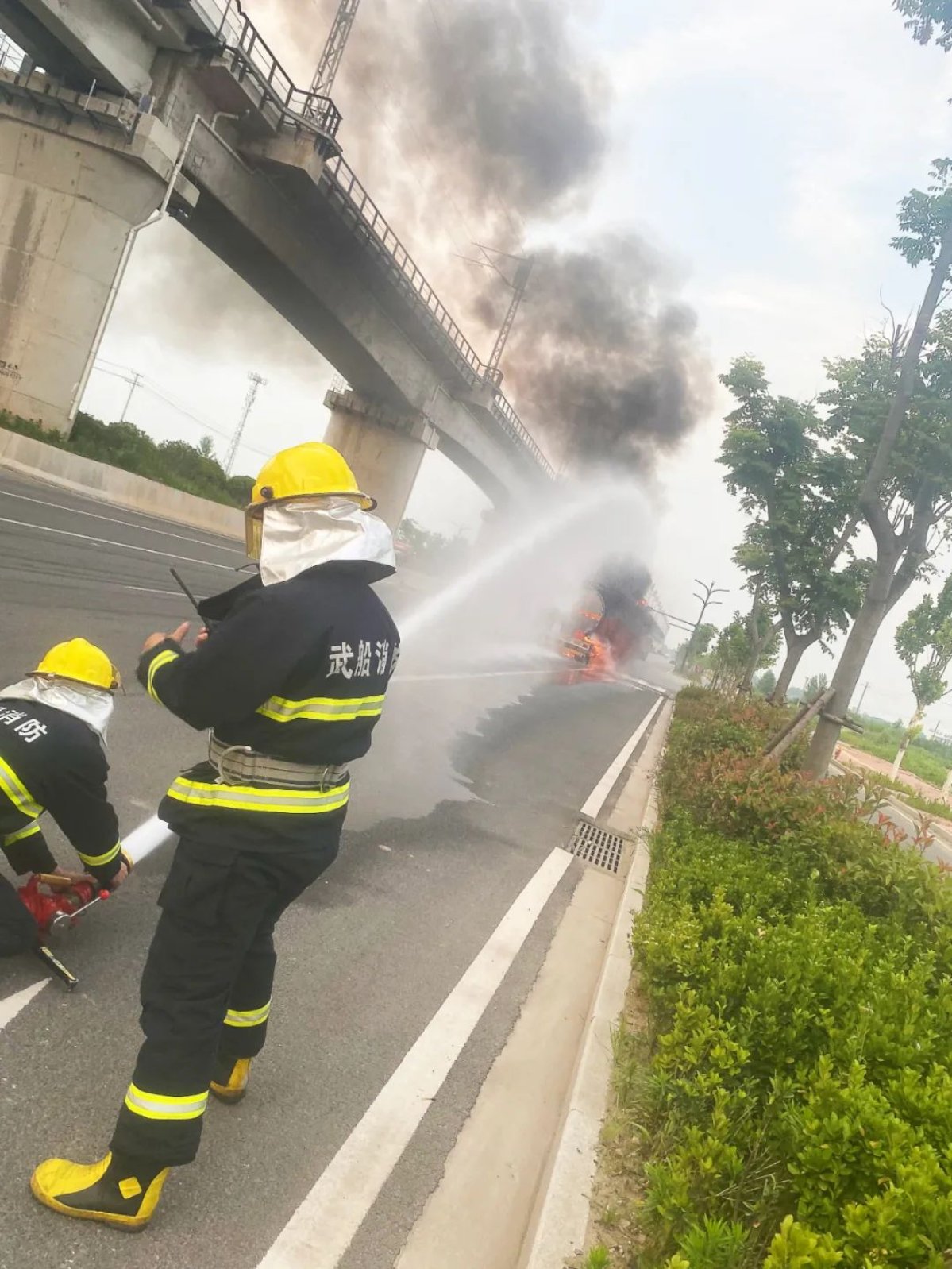 6月12日晚19時,一輛汽油罐車在星谷大道上燃燒,武昌造船消防隊接到新洲區消防大隊的緊急出動命令,迅速趕赴現場。