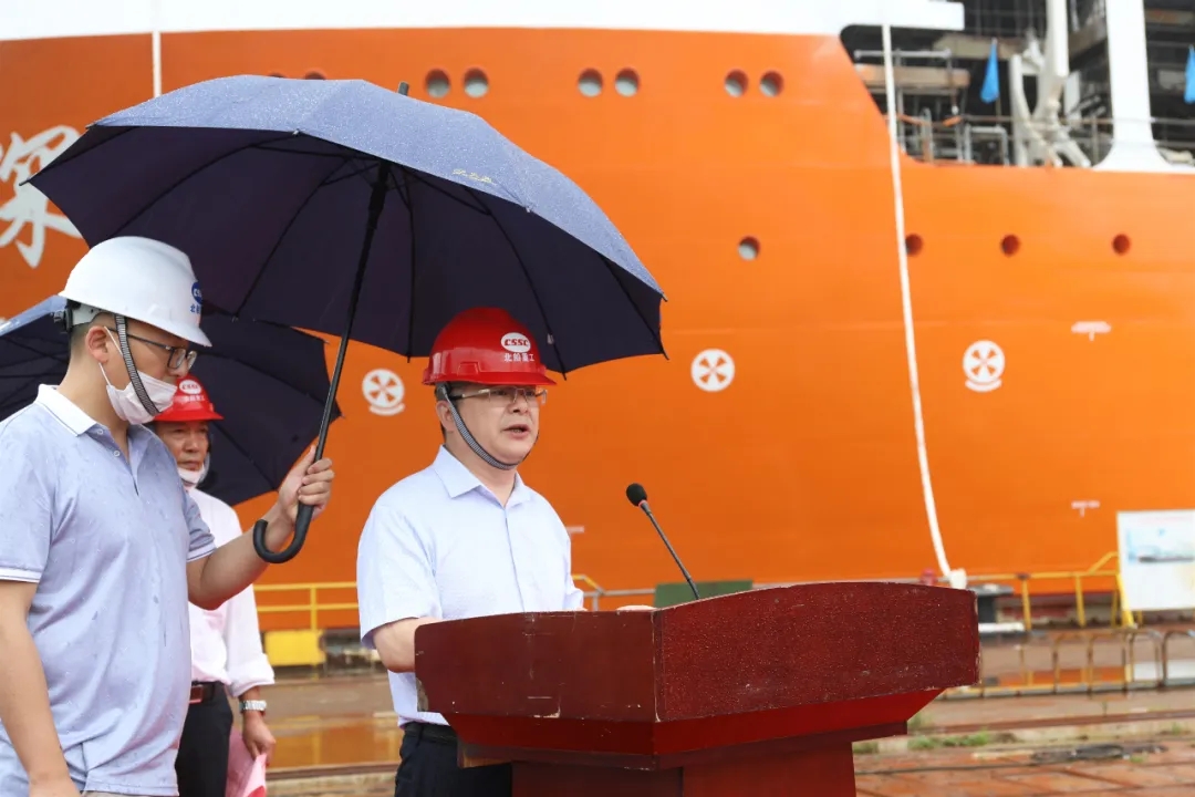 新型深潛水工作母船出塢儀式由武船集團(tuán)北船重工副總經(jīng)理馮寧主持,交通運(yùn)輸部上海打撈局副局長(zhǎng)、總工程師蔣巖與武船集團(tuán)黨委委員、北船重工黨委書記、董事長(zhǎng)王國(guó)海先后致辭,并同CCS船級(jí)社青島分社副總經(jīng)理鞠立強(qiáng)、DNVGL船級(jí)社大連青島分區(qū)經(jīng)理晏曉琳等共同為船舶出塢剪彩。