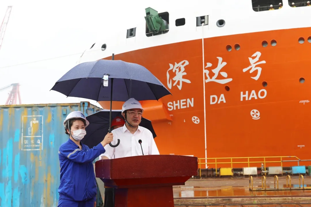 交通運(yùn)輸部上海打撈局深海工程技術(shù)研發(fā)中心主任黃衍、新型深潛水工作母船船東監(jiān)造組首席代表王金龍、武船集團(tuán)相關(guān)領(lǐng)導(dǎo)等參加儀式。
