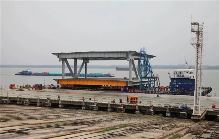 下午13時,首節(jié)鋼桁梁段成功裝船,順利拉開全橋發(fā)運的序幕。在完成綁扎固定和檢查后,船舶離岸,靠泊雙柳90米2#碼頭。