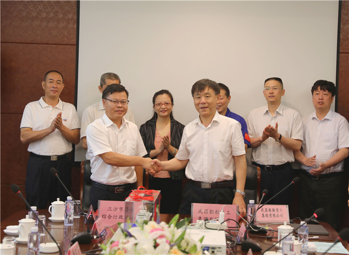 三沙市海洋綜合行政執法局局長徐向國、武船集團副總經理王渭齡代表雙方在建造合同上簽字。三沙市政府副市長馬珈,三沙市招標采購中心主任張彬元,中國船級社武漢分社副總經理余德斌,中船重工第七O一研究所經營產業處副處長孫曉暉、上海分部副主任趙德亮參加活動。