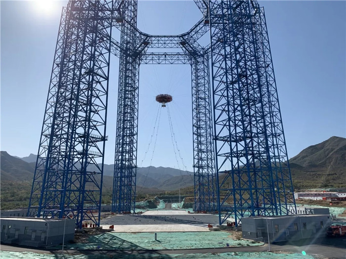 2019年6月,試驗場6個鋼結構塔架拔地而起,與之相匹配的共18套絞車設備、36根鋼絲和700余組(高空500余組、近地200余組)導向輪,以及相關配套電纜、電氣設備設施的安裝工作接近尾聲,待“隨動盤”運到,便可以開始進行總裝和調試工作。