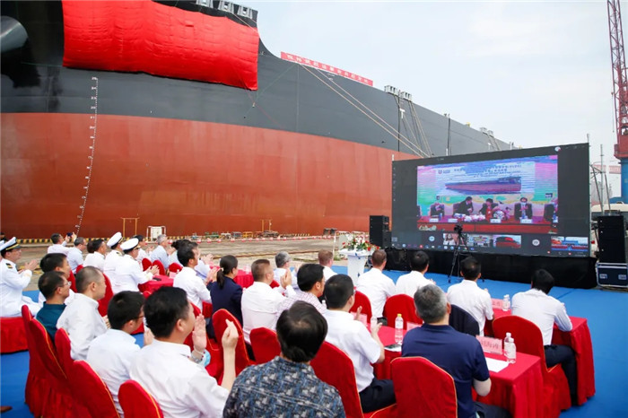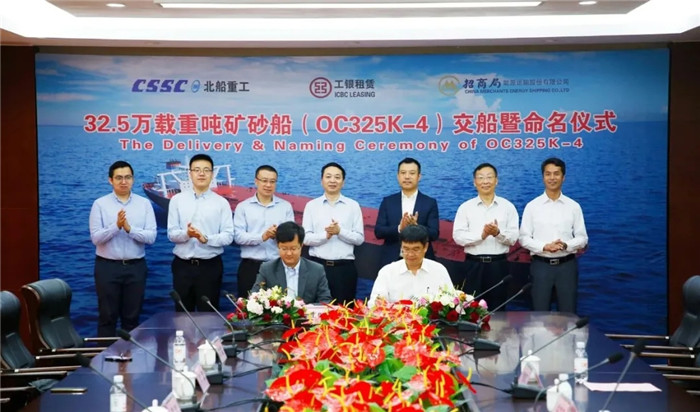 上午9:00,武船集團北船重工為工銀租賃和招商輪船建造的第四艘32.5萬噸礦砂船“ORE CHONGQING”輪命名暨交船儀式在3號碼頭舉行,這是各方在黨中央的正確領導下,抗擊疫情取得的重要成果。工銀租賃航運金融事業部副主管賈浩、北船重工總經理谷克超代表雙方簽署了交船議定書。