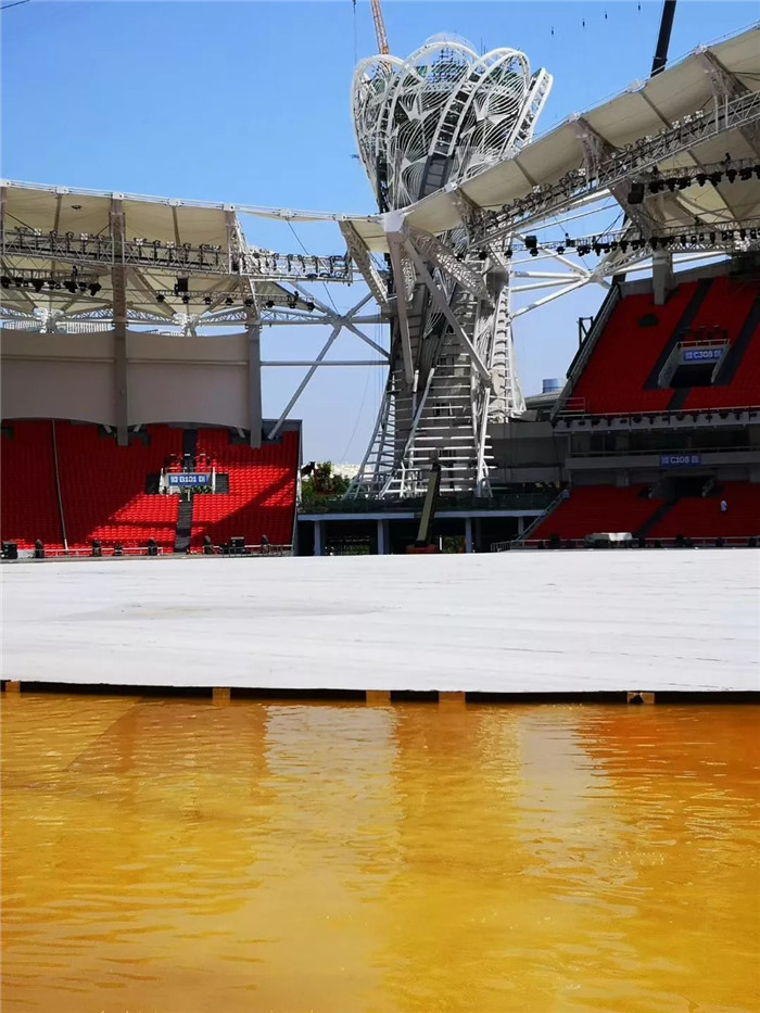 但在實際施工過程中,武船的項目團隊需要考慮并兼顧美工、演出等其他團隊,如果先做水區臺面,那么后期美工團隊將無法按計劃準時完成干區大面積舞臺的美化工作,一些大場面的演出團隊也無法進行多次預演來保證開幕式的“零差錯”。