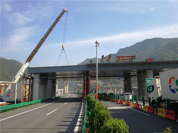 濟祁高速三覺互通連接線新橋大橋項目為單拱斜跨斜拉橋,分為鋼箱拱、鋼梁橋面結構和人行梯道橋三部分,工程總噸位約為5400噸,其中大橋主拱跨徑170米,主拱高度72.6米,主拱結構總重約2000噸,主拱軸線與橋梁縱向水平面夾角為25度,新橋大橋主拱的順利合攏為后續(xù)大橋鋼梁橋面結構的施工奠定了堅實的基礎。