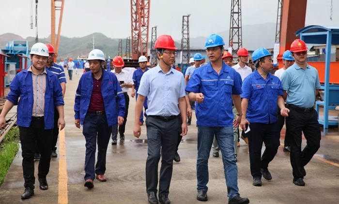 在開工儀式之前,平南三橋建設相關單位領導在吳躍波的陪同下參觀了武船南方基地,查看了場地布置、“7S”管理和各類宣傳展牌,聽取了項目負責人關于工程開工前各項準備工作的匯報。