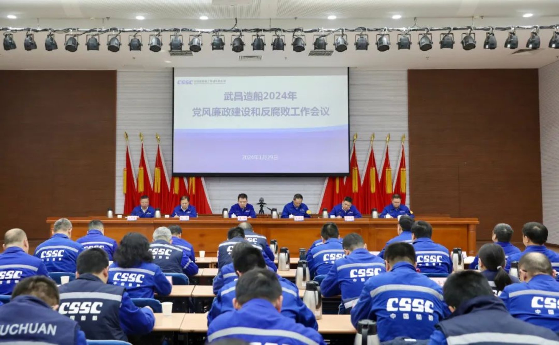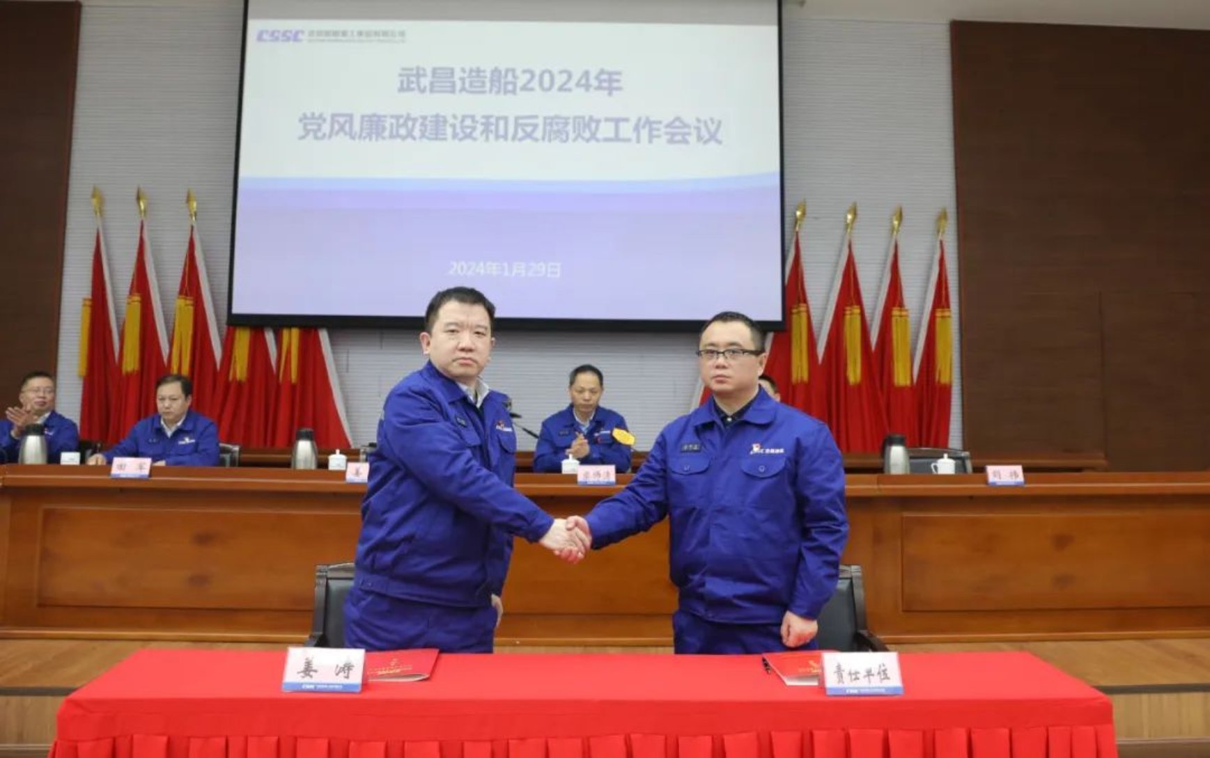 1月29日,中國船舶集團武昌造船召開2024年黨風廉政建設和反腐敗工作會議。武昌造船黨委書記、董事長姜濤出席會議并講話。黨委副書記、總經理梁師清主持會議,并傳達了二十屆中央紀委三次全會精神和集團公司2024年黨風廉政建設和反腐敗工作會議暨警示教育大會精神。黨委委員、紀委書記左照海作了題為《忠誠履職 擔當作為 以紀檢工作新質效助推價值創造 為公司改革深化提升 高質量發展提供堅強保障》的工作報告。公司領導田軍、陳仲明、劉祎,公司助理級領導、公司紀委委員,中層副職及以上管理人員參加會議。