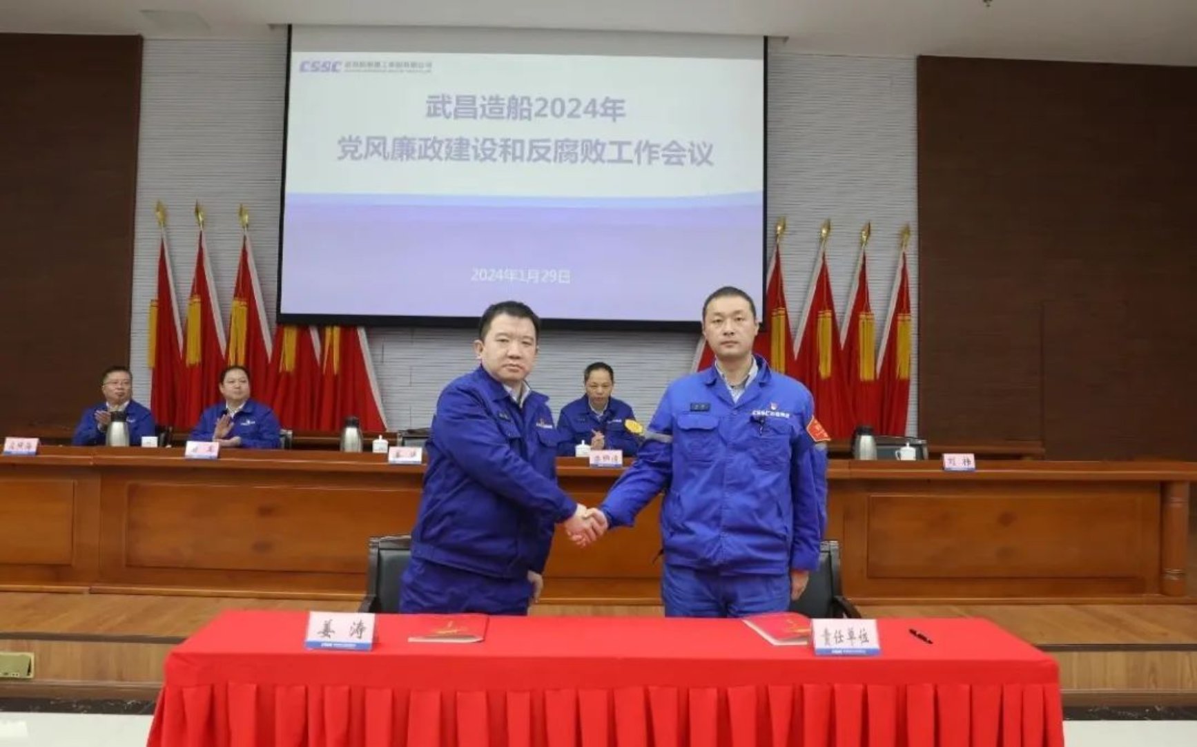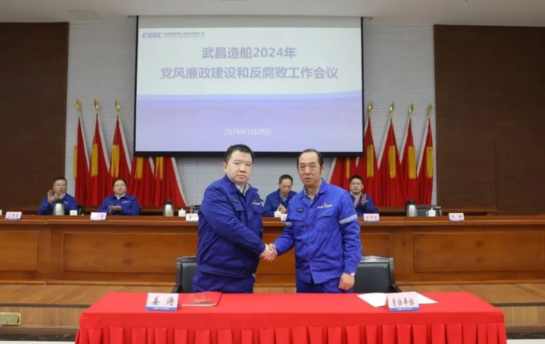 會上,黨委書記、董事長姜濤分別與特船事業部、生產管理部、重工公司等三家單位代表簽訂了2024年黨風廉政建設責任書。