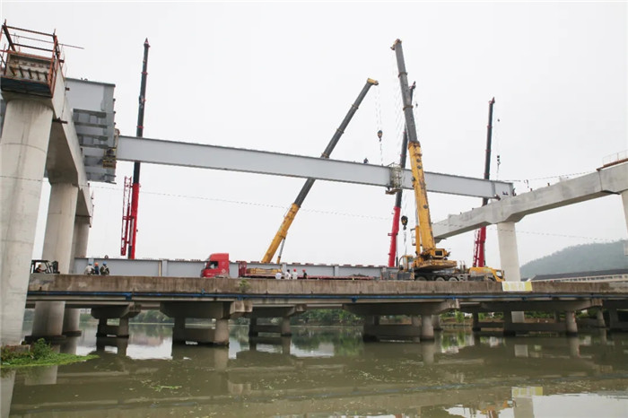 6月7日,浙江臺州路澤太高架溫嶺段跨越金清港(項目名稱:路澤太高架TJ03標段第126聯跨麻車橋60米跨鋼梁)的“橋上架橋”鋼板橋梁安裝過半,在不久前的5月30日,該施工區域順利完成了第一根60米鋼梁的試吊安裝。