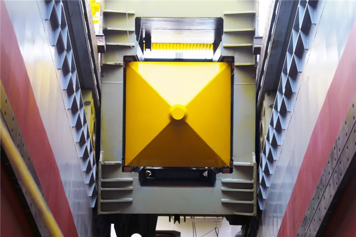 ▲通過與移船臺車方孔之間的微小間隙,巨型鋼樁與移船臺車實現(xiàn)高空精準交會對接;