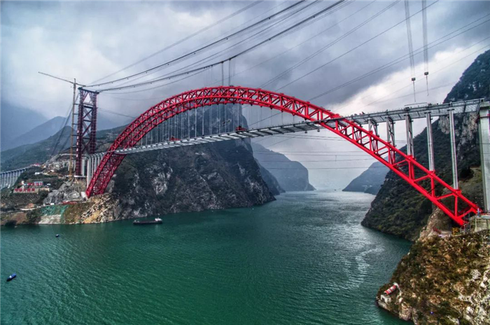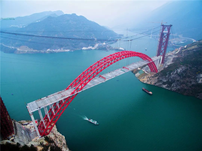 香溪長江公路大橋位于湖北宜昌秭歸兵書寶劍峽峽口,橋梁主跨531.2米,橋面寬32.3米,是目前世界最大跨度的鋼箱桁架推力拱橋,大橋在今年5月22日實現了主拱合龍,8月30日拱上立柱吊裝完成,隨后開始架設鋼主梁,主梁架設歷時約4個月。本次合龍段施工包括2根主縱梁、7根中縱梁、8根橫梁、2塊人行道板施工。