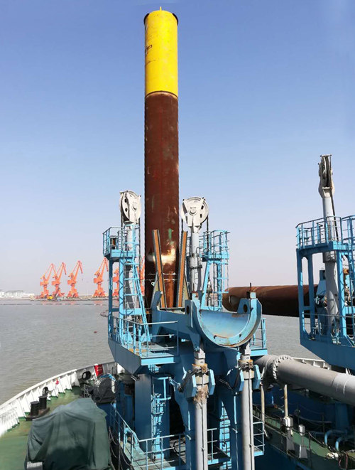 鋼樁定位系統安裝在挖泥船艏部,由高達42米的主輔鋼樁部套以及臺車系統組成,用來“鎖定”浮在水面的挖泥船,實現挖泥船持續穩定絞吸水底泥沙。