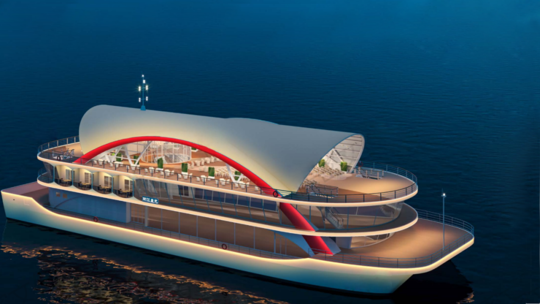 全船總長61米,型寬22米,型深4米,航速22km/h,雙體船造型,船體共分為三層,可同時容納乘客750人。本船主要用于婚禮、宴會包船,兼顧長江水域游覽觀光,具有良好的觀光效果和服務功能,船內以“現代豪華”為主題設計,裝飾造型設計上,巧妙地運用了武漢多個標志性建筑的經典元素,突顯武漢絢麗多彩的城市風格,營造了溫馨浪漫的客艙環境。船上餐飲、娛樂、婚禮、會務等設施一應俱全,完備的功能,將成為長江流域,觀光、旅游一道亮麗的風景線。