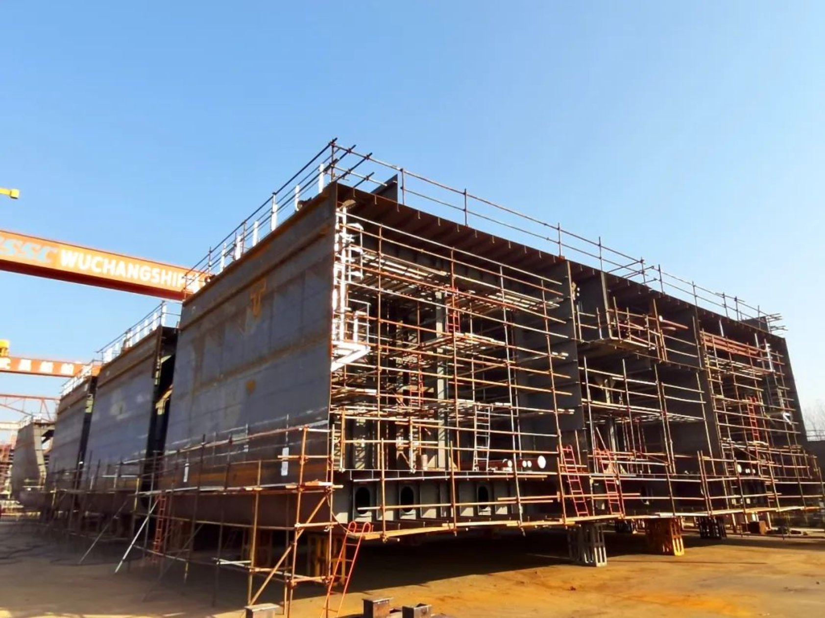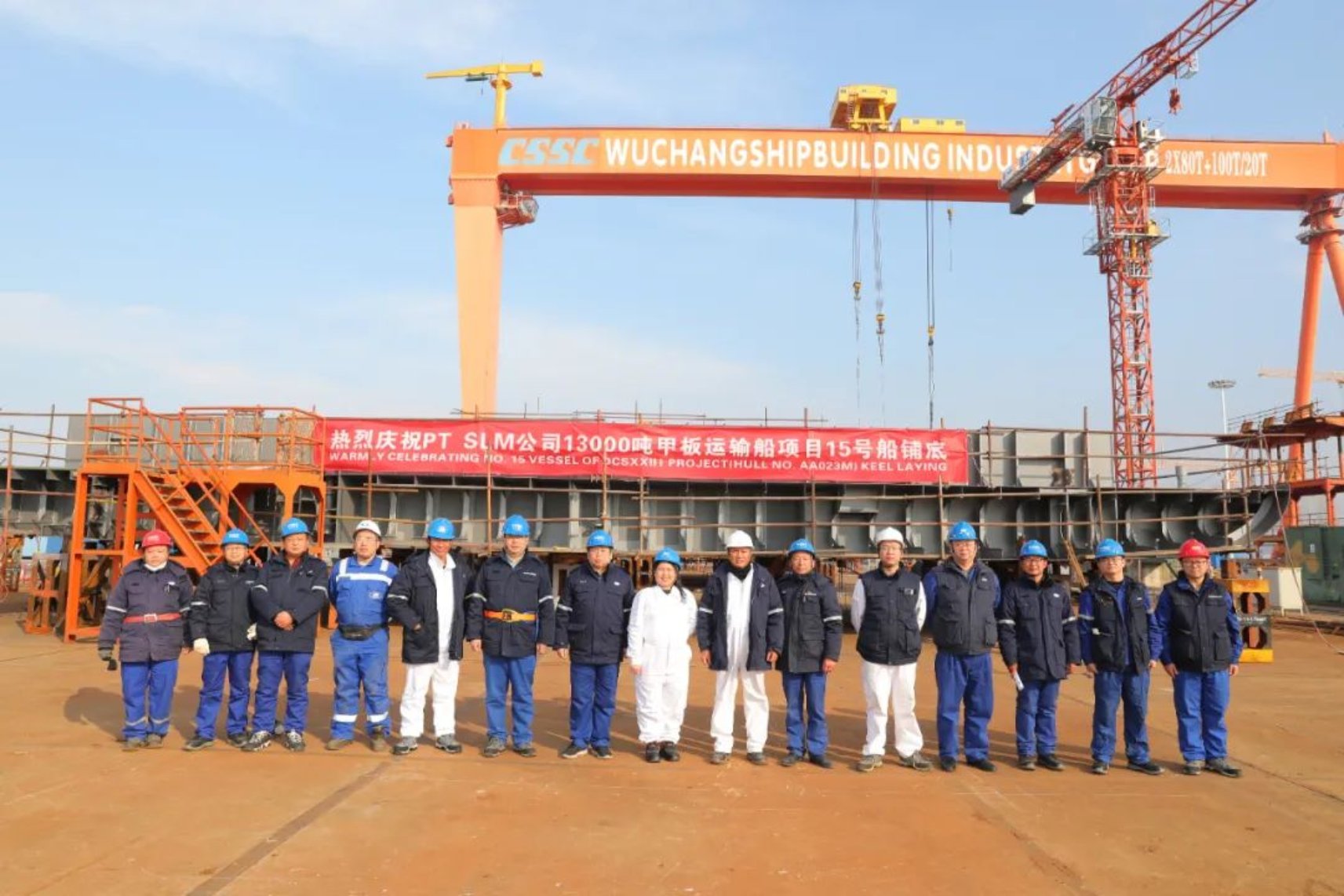 12月22日下午2點38分,由武昌造船承建的第15艘13000DWT甲板運輸船順利實現上船臺節點,比計劃時間提前5天,同時標志該船正式進入船臺搭載階段。船東、船檢以及相關單位負責人參加上船臺儀式。