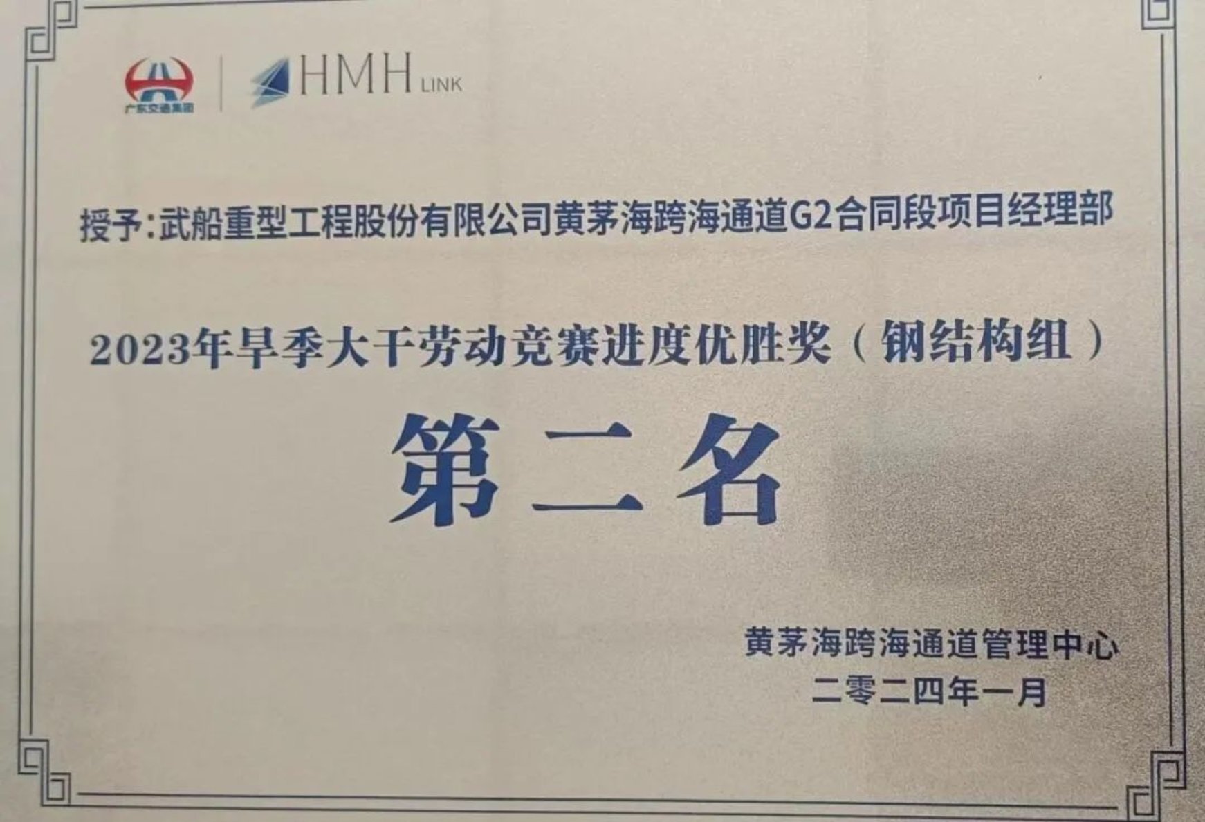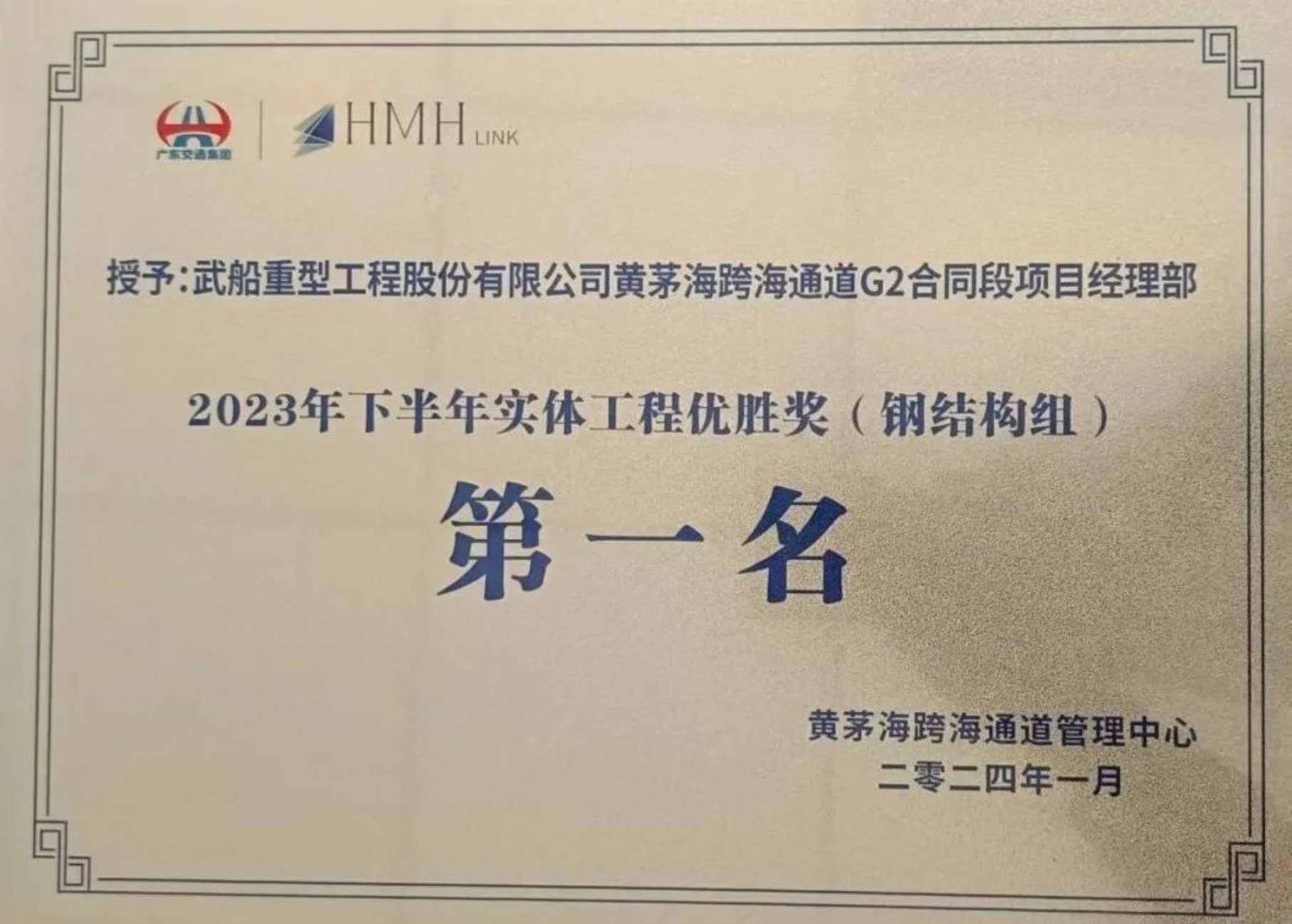 131日,從黃茅海跨海通道管理中心傳來喜訊。中國船舶集團武昌造船重工公司黃茅海跨海通道G2合同段項目經理部,獲得業主頒發的4個獎項: